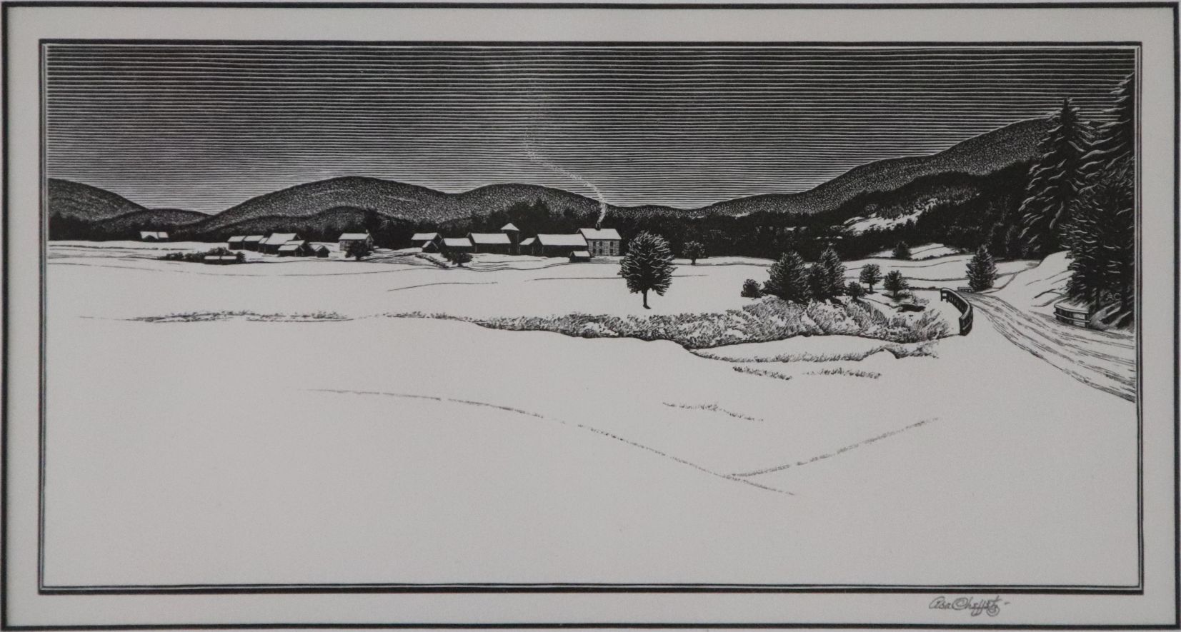 This is a wood engraving by American artist Asa Cheffetz. Cheffetz is an acknowledged master of this medium. He worked in New England in the early to mid 20th century. His subject matter represent typical New England landscapes and include villages, churches, lighthouses, and covered bridges. This scene is depicts a village in winter. Snow occupies the lower half of the piece with just a few marks to indicate the rolling terrain. The village roofs are snow-covered and set against dark hills. There is just a hint of light behind the hills suggesting the sun has just set. There is a plowed road entering from the right and its curve is echoed by a thin plume of smoke from a chimney. He masterfully conveys the quiet, tranquil peace of a winter night. A beautiful example of his work.